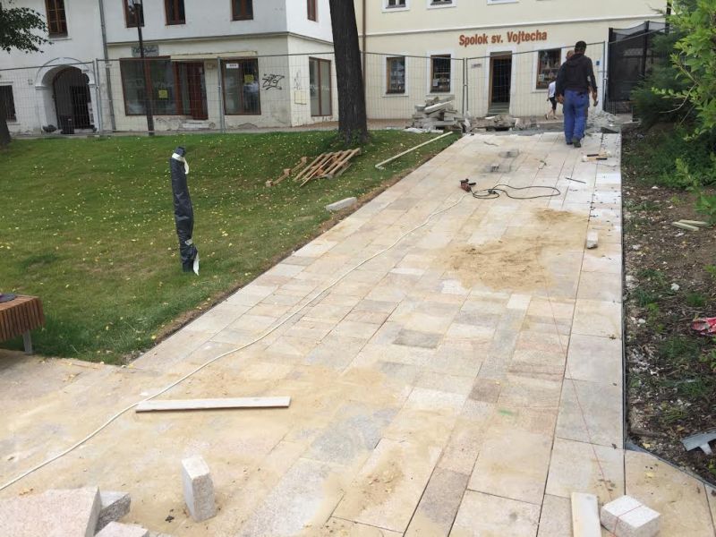 Priestor kde je kladená dočasná dlažba. Tá bude menená v septembrovom termíne.